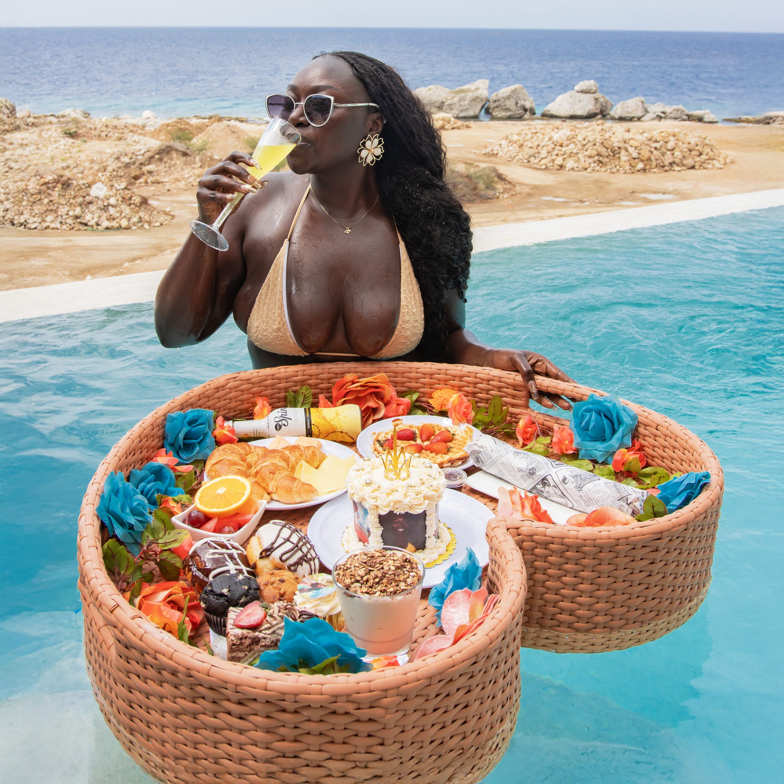 A stunning floating tray photoshoot features an array of delicious treats: a fresh sandwich, muffins, boiled eggs, orange juice, creamy yogurt, flaky croissants, decadent desserts like cake and fruits, refreshing coconut, fluffy pancakes or waffles, and a chilled bottle of champagne or wine, creating a luxurious, inviting scene of indulgence and relaxation.